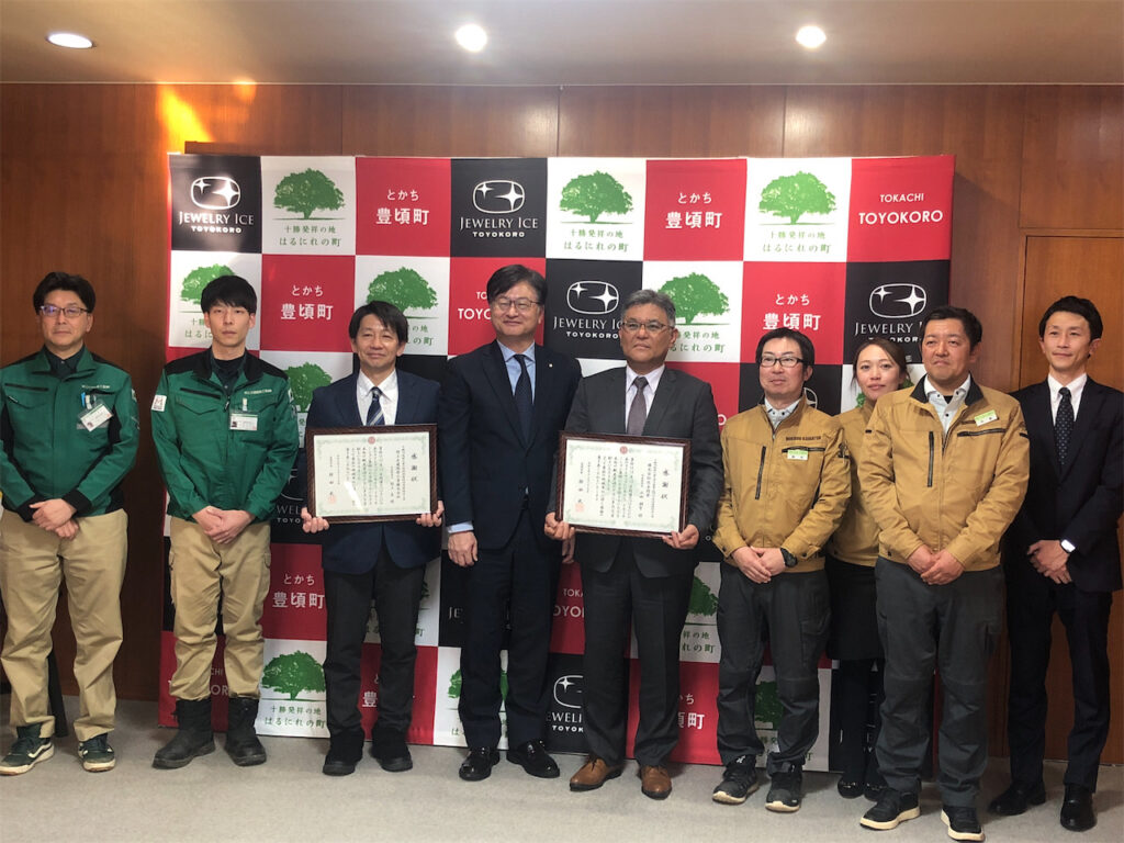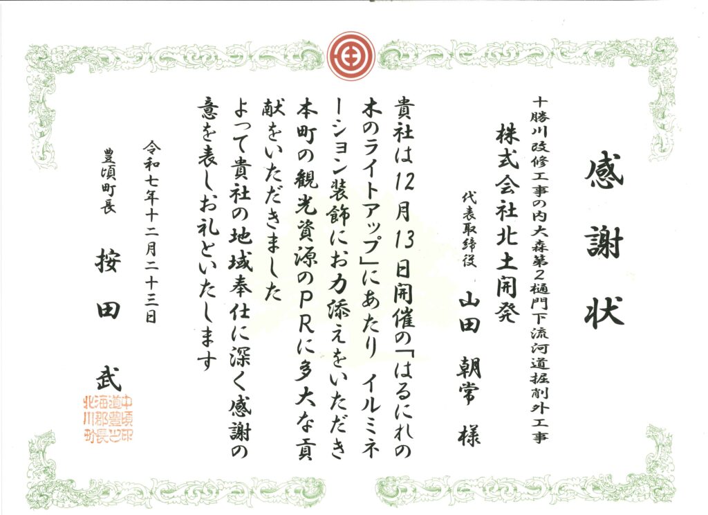 12月23日(火)にイルミネーション装飾に参加した2現場で豊頃町長 按田 武様より感謝状を授与致しました。