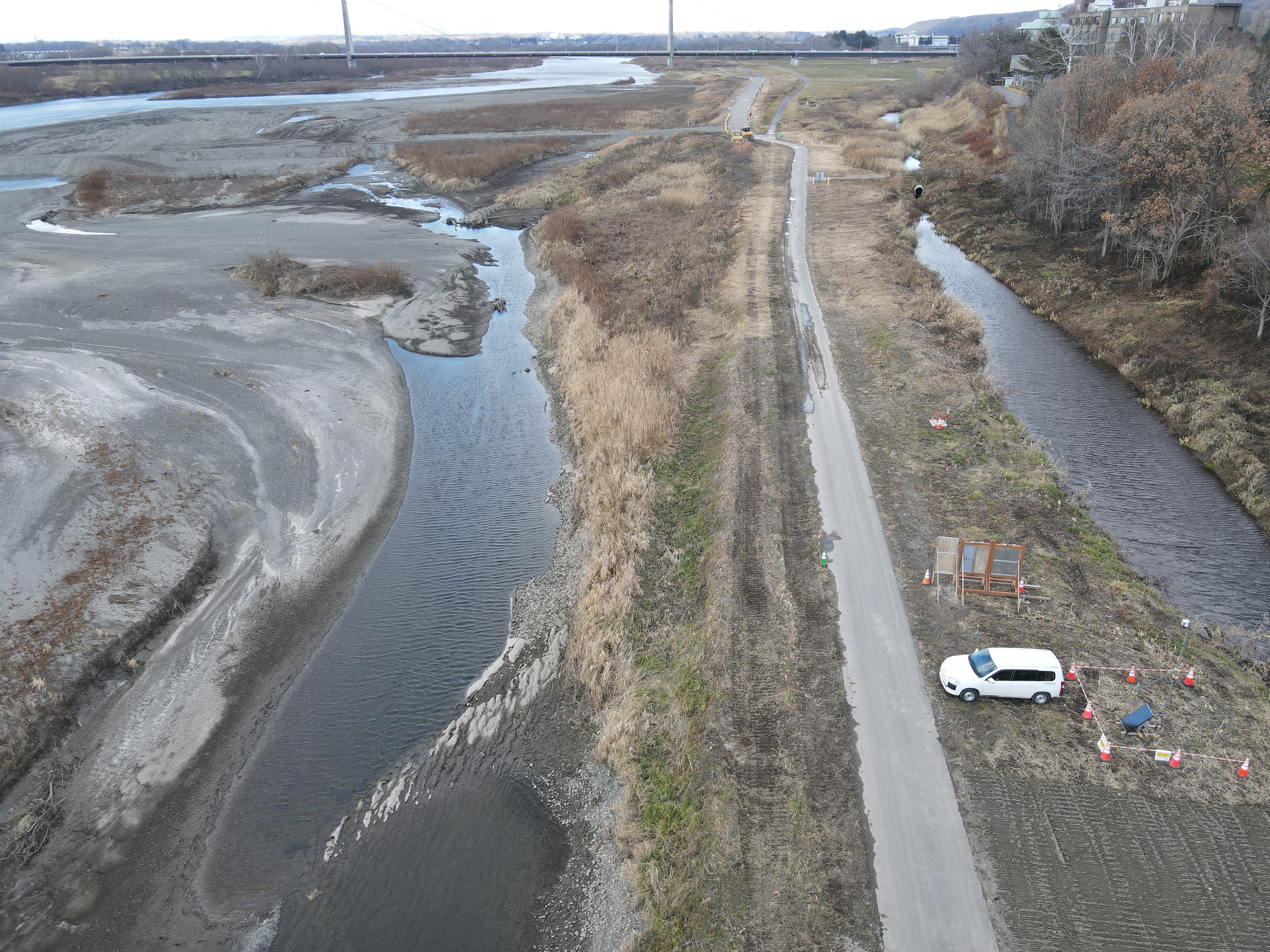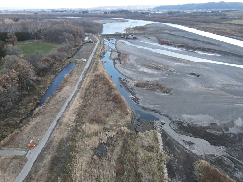 本工事は、帯広河川事務所管内河川の適切な維持管理を目的に、十勝川本川において河岸保護及び河道整正を行うほか、札内川において路面補修を行います。