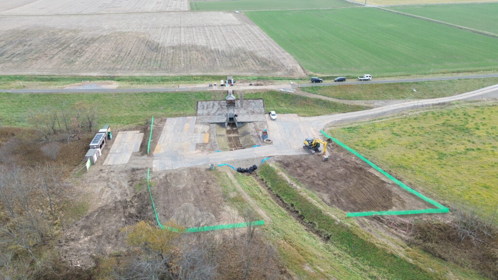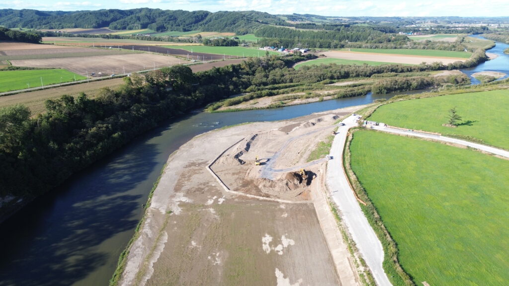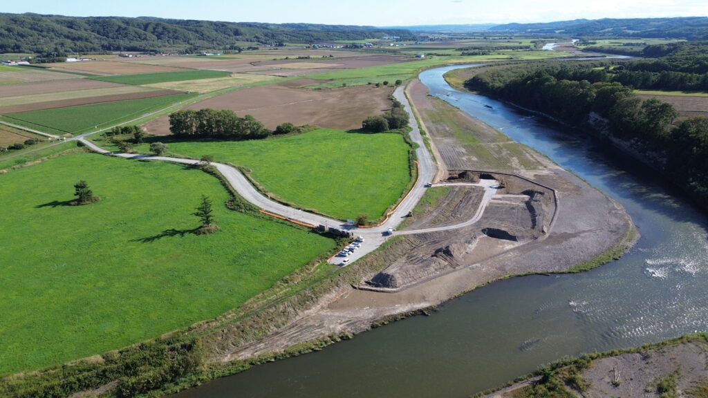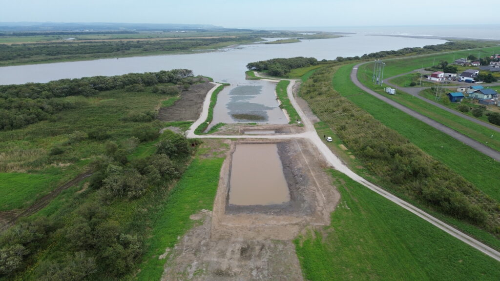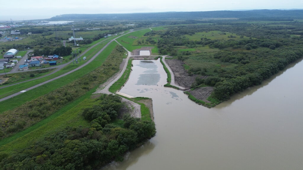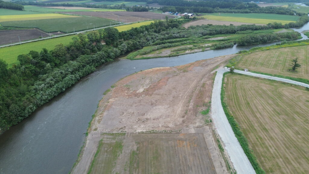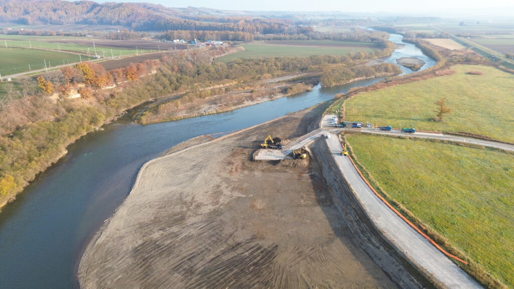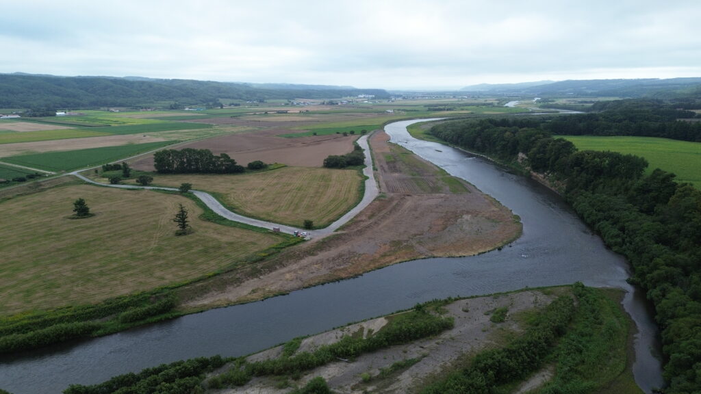 本工事は、洪水を安全に流下させるため利別川の河道掘削(大森地区)を行うとともに、洪水対応の迅速化を図るため利別川において樋門(勇足第2樋門地区)のフラップゲート化を行う工事です。また、十勝川水系自然再生実施計画に基づき、十勝川(大津地区)においてワンドの整備をします。